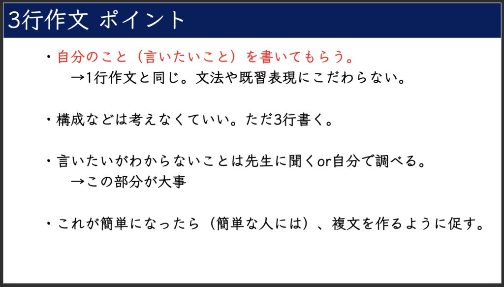 私が作文練習で推しているのは「3行作文」です。3行でも複文などを駆使して書けば割と複雑な内容の文章も書けるし、なかなか良い練習になると思っています。