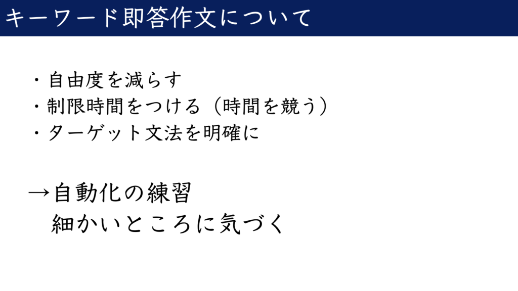 この記事では、③自動化のための練習で紹介した「キーワード即答作文」という活動についてのみ書いておきます。