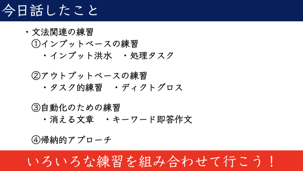 ただ、タイトルは「教える」となっているものの、実際の内容は「文法に焦点を当てた活動の紹介」となっています。下の写真が、この講義の最終スライドです。
