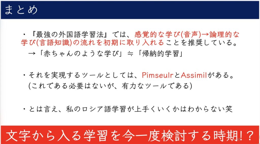↑これが私の講演の最後のスライドです。一番下の赤字の部分「文字から入る学習を今一度検討する時期!?」が私の主張だと考えてもいいでしょう。